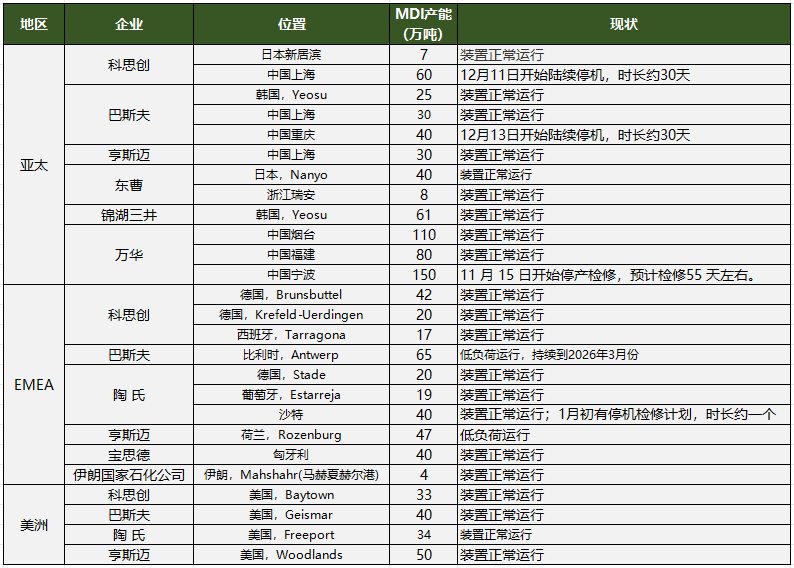 全球MDI装置动态汇总