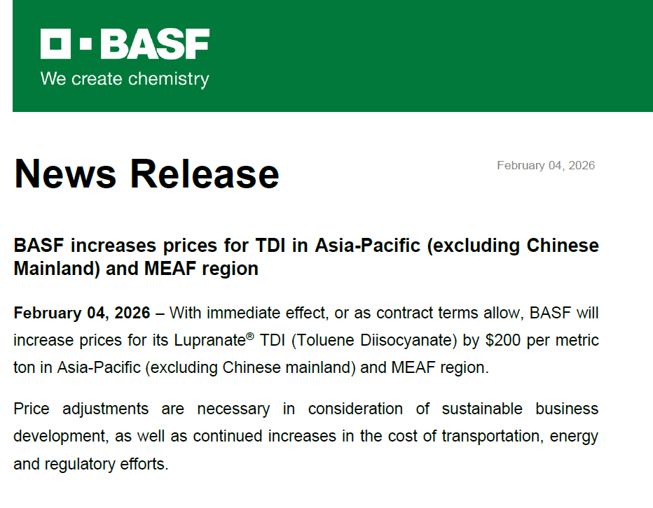 巴斯夫上调亚太地区(不含中国大陆)及MEAF