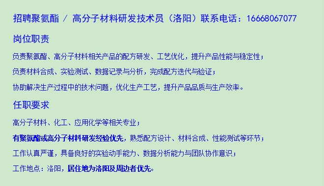 [企业招聘] 招聘聚氨酯 / 高分子材料研发技术员(洛阳) |